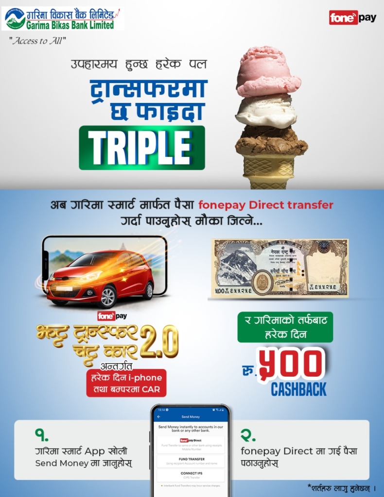 गरिमा विकास बैंकले आउँदै गरेको तिहारलाई लक्षित गरि डिजिटल बैकिङ्गलाई प्रोत्साहन गर्न ‘ट्रान्सफरमा छ फाईदा ट्रिपल’ नामक अभियान लिएर आएको छ । फोनपेले लेराएको आईबिएफटि केन्द्रित ‘झट्ट ट्रान्सफर चट्ट कार २.०’सँग प्रेरित रहि डिजिटल बैकिङ्गलाई प्रोत्साहन तथा प्रबद्र्धन गर्न गरिमा विकास बैंकले यो अभियान लिएर आएको हो ।