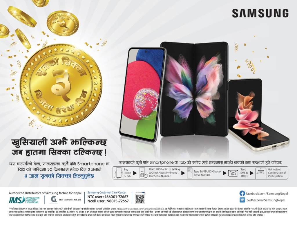 सामसङ मोबाइलले ग्राहकलाई लक्षित गरेर नोभेम्बर १ देखि ३० तारिखसम्मका लागि संचालन गरिरहेको रहेको उपहार योजनाको पहिलो लक्की ड्रको नतिजा सार्वजनिक गरेको छ।