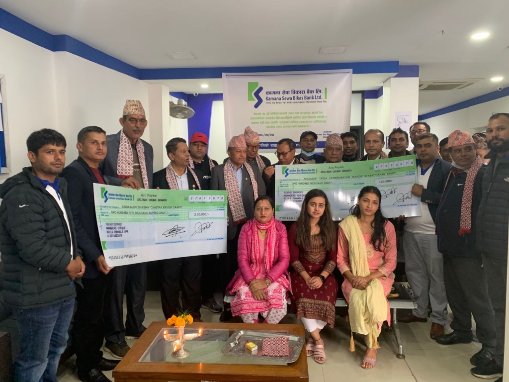 कामना सेवा बैंकद्वारा विन्ध्यवासिनी धार्मिक क्षेत्र बिकास समिती र अकलादेवी तथा लक्ष्मी नारायण मन्दिर व्यवस्थापना समितीलाई आर्थिक सहयोग
