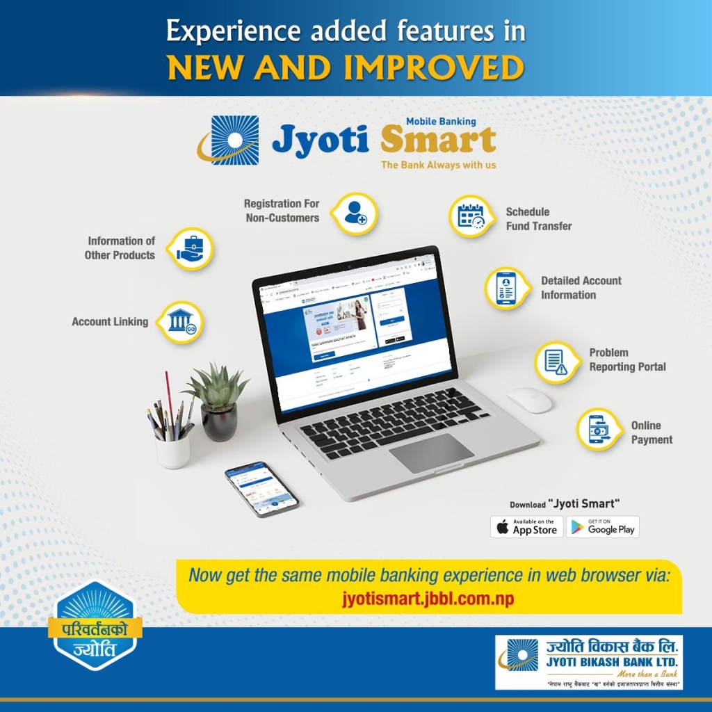 बैंकले यहि मिति २०७८ साल मंसिर ५ गते देखि डिजिटल बैंकिंग सेवालाई लाई थप प्रर्वद्धन गर्दै बैकमा खाता भएका एवं नभएका ग्राहकलाई समेत लक्षित गर्दै समान रुपले डिजिटल बैंकिङ्ग सेवा प्रदान गर्ने उद्देश्यले ज्योति स्मार्ट मोबाइल बैंकिङ्ग एप अपग्रेड गरेको हो ।