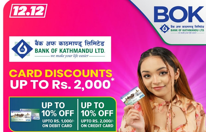 बैंक अफ काठमाण्डू लिमिटेडको डेबिट तथा क्रेडिट कार्ड बाहक ग्राहकहरुले दराजको १२.१२ योजनामा दुई हजारसम्म छुट पाउने भएका छन् । पछिल्लो समय ग्राहकहरुमा प्रबिधिको प्रयोग गरि अनलाईन मार्फत आफुलाई आवश्यक विभिन्न समानहरु खरिद गर्ने बानी रहेकोले बैंकले आफ्नो कार्डबाहकहरुलाई प्रबिधिको प्रयोगमा उत्प्रेरित गर्नुको साथै दुई हजारसम्मको विशेष छुटको योजना ल्याएको हो ।