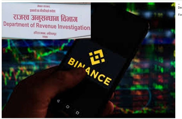 राजश्व अनुसन्धान विभागले बाईनान्स मार्फत क्रिप्टोकरेन्सी कारोबार गर्ने ४ जना विरुद्द ३७ करोडको मुद्दा दायर गरेको छ। विभागले कैलालि लम्किचुवा १० स्थायी ठेगाना भई हाल काठमाडौं कालोपुल गुरुङ्टोलमा बस्ने दिनेश खड्का, उनकी दिदी भगवती खड्का , उनका बुबा नर वहादुर खड्का र उनकी साथी अनिता धिताल विरुद्द ३७ करोड ६४ लाख ११ हजार एक सय रुपैयाँ माग बिगो दाबी सहित आज काठमाडौँ जिल्ला अदालतमा मुद्दा दायर गरेको हो।