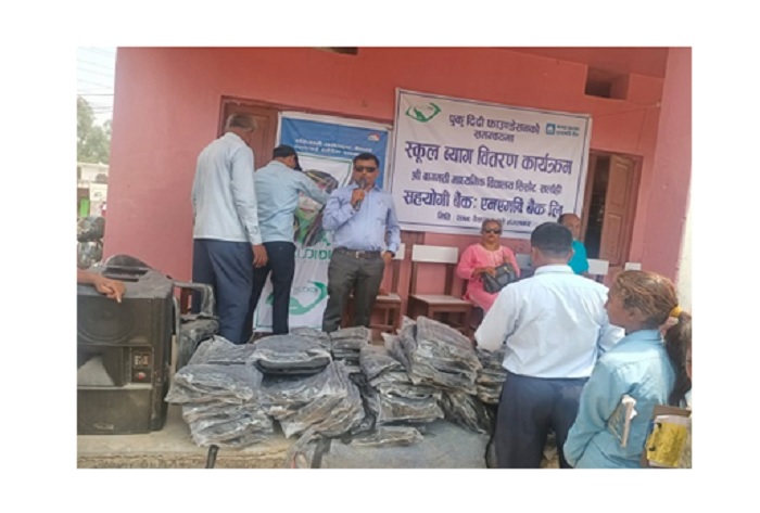 एनएमबि बैंकले विद्यार्थिहरुलाई स्कुल झोला वितरण गरेको छ । बैंकले सामाजिक दायित्व अन्तर्गत पुकु दिदी फाउण्डेशन र वाग्मती मावि, सिसौट सर्लाहीका प्रधानाध्यापक राम सिंहासन रायको उपस्थितिमा उक्त विद्यायलका विद्यार्थीहरुलाई स्कुल झोला वितरण गरिएको हो ।