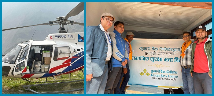 कुमारी बैंक लिमिटेडले आफ्ना ग्राहकहरूको सेवा–सुविधालाई मध्यनजर गर्दै सडकको पहुँच नपुगेको स्थानमा भौतिक रुपमा नै सहयोग पुर्याउने अभिप्रायले चुमनुब्री गाउँपालिकामा हेलिकप्टर चार्टर गरेर वृद्धभत्ता पुर्याउने कार्य सम्पन्न गरेको छ ।