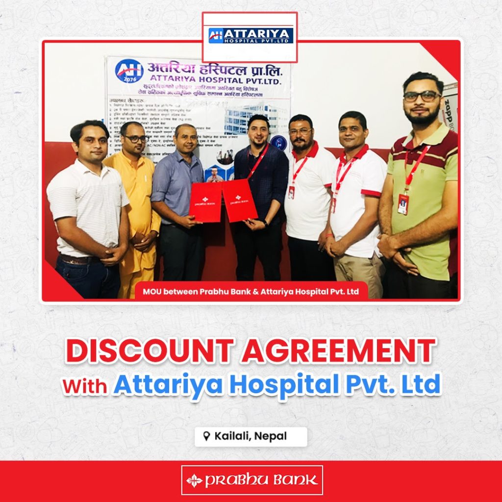 प्रभु बैंकका ग्राहकहरुले कैलालीको अत्तरिया हस्पिटलको विभिन्न सेवाहरुमा छुट पाउने भएका छन्। बैंकका तर्फबाट धनगढी शाखा कार्यालय प्रमुख रविकान्त जोशी र अत्तरीया हस्पिटलका तर्फबाट प्रबन्ध निर्देशक आनन्द पाठकले उक्त सम्झौतामा हस्ताक्षर गरेका छन्।