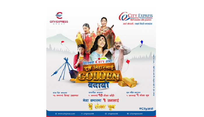 सिटी एक्सप्रेस मनी ट्रान्सफरले गत भदौ १५ गते समस्त नेपालीहरुको महान चाड २०७९ सालको दशैं, तिहार र छठ्लाई लक्षित गर्दै आफ्ना ग्राहकवर्गहरुसंग पर्वको खुशी साट्न लगातार ६३ दिनसम्म चल्ने ‘बिदेशबाट सिटी आयो, दशैं तिहारलाई गोल्डेन बनायो’ उपहार योजना घोषणा गरेको थियो । सोही योजना अन्तर्गत लक्की ड्र मार्फत हरेक महिना १ जनालाई १ तोला सुन, हरेक हप्ता १ जनालाई १० तोला चाँदी साथै ६३ दिन लगातार हरेक दिन १६ जना विजेताहरुलाई आकर्षक गिफ्ट ह्याम्पर र अन्त्यमा एक जना भाज्ञशाली बम्पर बिजेतालाई ५ तोला सुन उपहार प्रदान गरिने छ ।