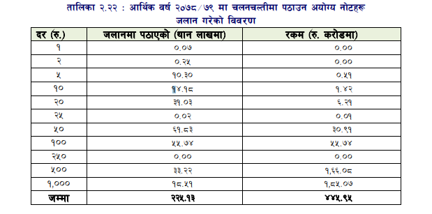 राष्ट्र बैंकले गत आर्थिक बर्षको बार्षिक प्रतिवेदन सार्वजनिक गर्दै चलनचल्तिमा पठाउन अयोग्य नोटहरु जलाएको जनाएको छ।