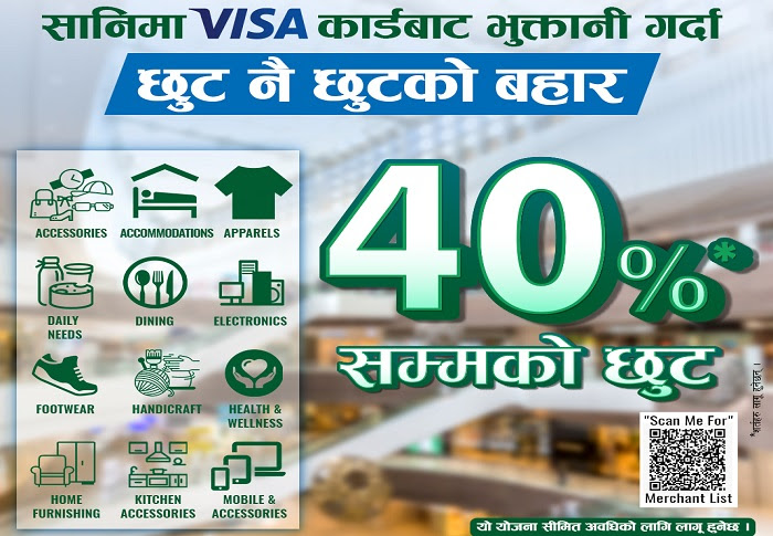 काठमाडौं, ललितपुर, भैरहवा, वीरगन्ज, चितवन र पोखराको ३३२ मर्चेन्टहरुमा छुट उपलब्ध हुनेछ । साथै, सहकार्य भएका मर्चेन्टहरुको विवरण, छुटको विवरण र छुट अवधि बैंकको आधिकारिक वेबसाइटमा उपलब्ध छ ।