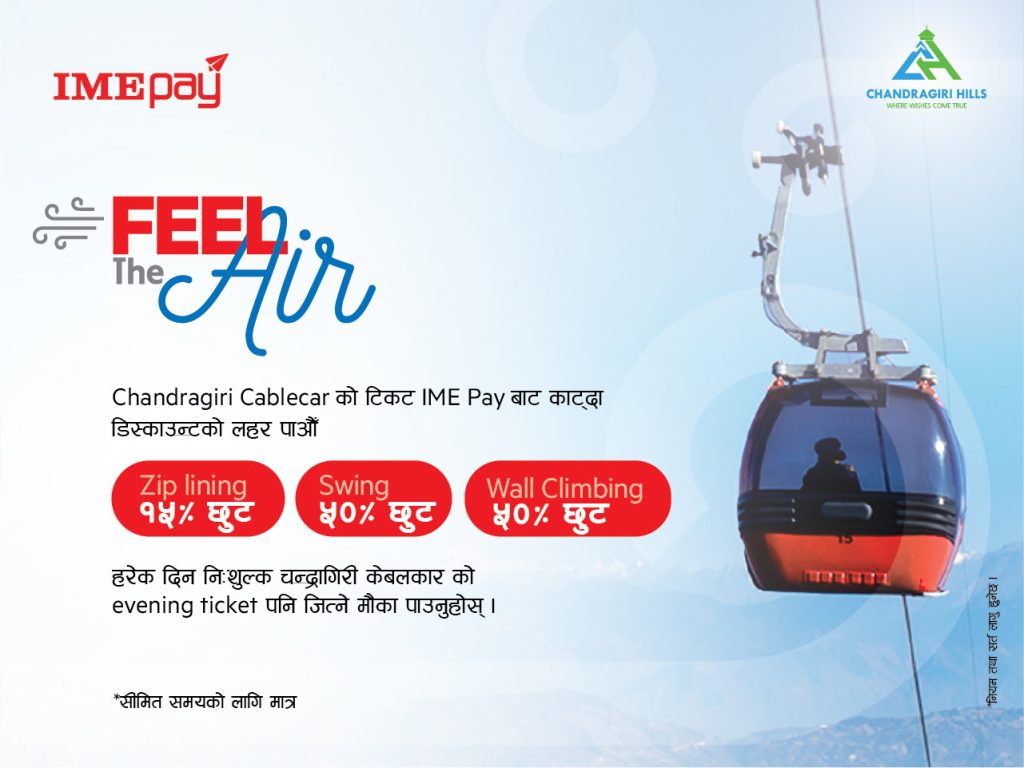 आइएमई पे र चन्द्रागिरि हिल्सवीच फील द एयर नामक अफर सार्वजनिक गरिएको छ । अफर अनुसार आइएमई पे वालेट एप प्रयोगकर्ताहरूले चन्द्रागिरि केबलकारको टिकट आइएमई पे एप मार्फत काट्यो भने चन्द्रागिरि हिल्समा रहेको विभिन्न राइड्सहरुमा छुटहरु प्राप्त गर्न सकिनेछ ।
