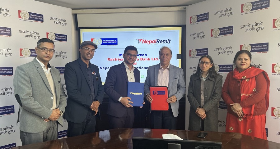 नेपाल रेमिट इन्टरनेशनल प्रालि र राष्ट्रिय वाणिज्य बैंकबिच बैदेशिक रेमिट्यान्स बैँकिङ्ग च्यानल मार्फत भुक्तानि गर्ने सम्बन्धि सम्झौता भएको छ । यस सम्झौता पत्रमा नेपाल रेमिट इन्टरनेशनलका प्रमुख कार्यकारी अधिकृत सागर खनाल र राष्ट्रिय वाणिज्यका तर्फबाट प्रमुख कार्यकारी अधिकृत किरण कुमार श्रेष्ठले हस्ताक्षर गरेका हुन् ।