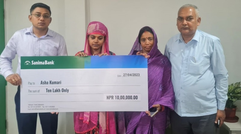 सानिमा बैंकले सानिमा दीर्घायु बचत योजना अन्तर्गत १० लाख रुपैयाँको दुर्घटना बीमा दाबी रकम भुक्तानी गरेको छ। बैंकका खातावाला उदय कुमार साहको दुर्घटना भई मुत्यु भएकोले निजको हकवाला श्रीमती आशा कुमारीलाई सानिमा दीर्घायु बचत योजना अन्तर्गत १० लाख रुपैयाँको दुर्घटना बीमा रकम भुक्तानी गरेको बैंकले बताएको छ।