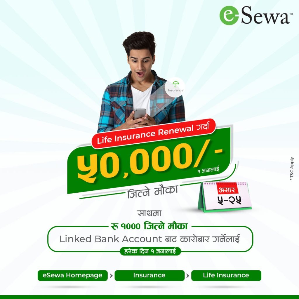 नेपालको पहिलो र अग्रणी भुक्तानी सेवा प्रदायक इसेवामार्फत लाइफ इन्स्योरेन्सको नवीकरण गर्दा रु. ५० हजार जित्न सकिने भएको छ।