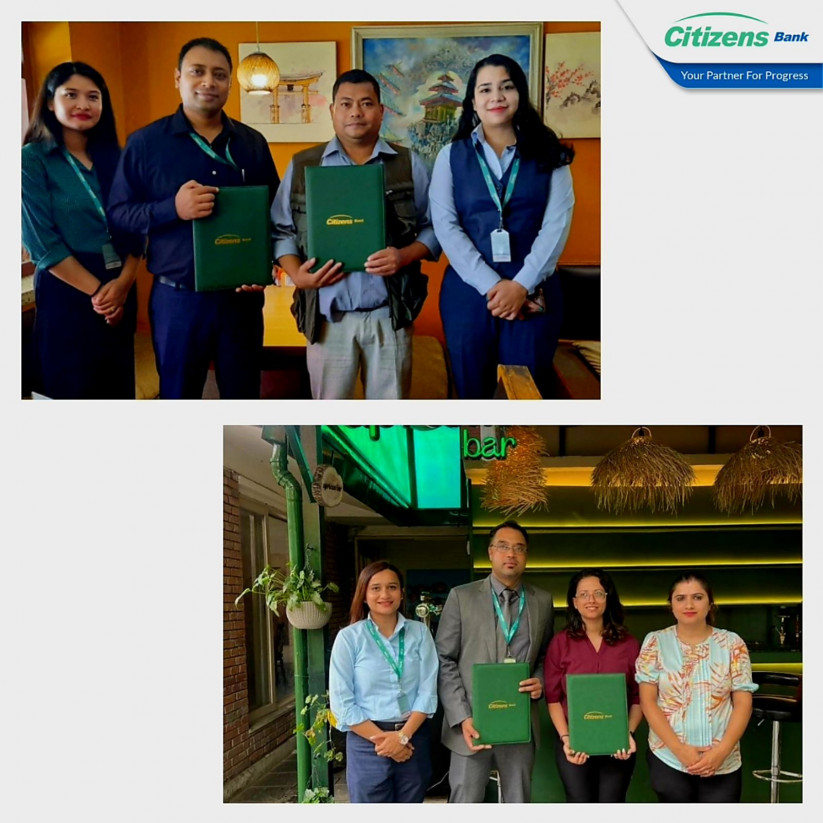 सिटिजन्स बैंक इन्टरनेसनल र काठमाण्डौको टंगालस्थित अप्रिकस क्याफे तथा ठमेलस्थित ठमेल मोमोतारु रेस्टुरेन्टबीच सिटिजन्स बैंकका कार्डबाहक ग्राहकलाई विशेष छुट दिने समझदारीपत्रमा हस्ताक्षर भएको छ।