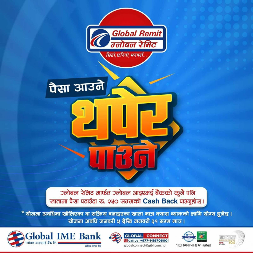 ग्लोबल आइएमई बैंकले ग्लोबल रेमिटमार्फत् विदेशबाट पैसा पठाउँदा २५० रुपैयाँसम्म क्यासब्याक पाइने नयाँ योजना सार्वजनिक गरेको छ ।