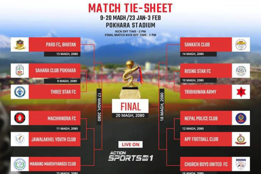 साविक विजेता संकटा क्लब, भुटानको पारो फुटबल क्लब, मनाङ मस्र्याङ्दी क्लब र लिग विजेता चर्च ब्वाइज युनाइटेड क्लबले भने सिधै क्वार्टरफाइनलमा प्रवेश पाएका छन् । प्रतियोगिताको फाइनल खेल माघ २० गते हुनेछ ।