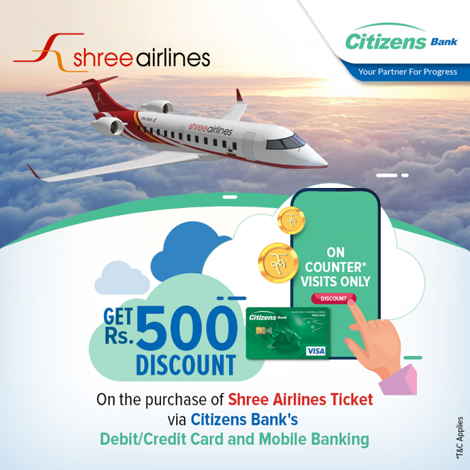 सो समझदारीपत्र अनुसार सिटिजन्स बैंकका कार्डबाहक र मोबाइल बैंकिङ ग्राहकहरूले श्री एयरलाइन्सको टिकट खरिदमा एकमुस्ट रु ५०० को आकर्षक छुट पाउनेछन् ।