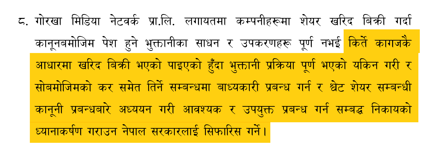 प्रतिवेदनमा भनिएको छ : ‘गोर्खा मिडिया नेटवर्क लगायत कम्पनीहरुमा शेयर बिक्री गर्दा कानुनबमोजिम पेश हुने भुक्तानीका साधन र उपकरणहरुमा पूर्ण नभई कीर्ते कागजकै आधारमा खरिद बिक्री भएको पाइएको हुँदा भुक्तनाी प्रक्रिया पूर्ण भएको यकिन गरी र सोबमोजिमको कर तिर्ने बाध्यकारी प्रबन्ध गर्न र स्वेट शेयर सम्बन्धी कानुनी प्रबन्धबारे अध्ययन गरी आवश्यक र उपयुक्त प्रबन्ध गर्न सम्बद्ध निकायको ध्यानाकर्षण गराउन नेपाल सरकारलाई सिफारिस गर्ने ।’