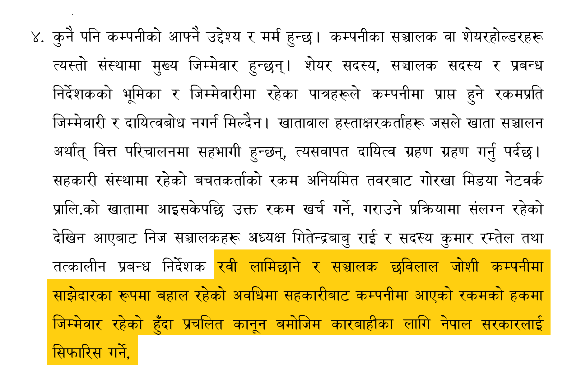 प्रतिवेदनमा उल्लेख छ : ‘….सहकारी संस्थामा रहेको बचतकर्ताको रकम अनियमित तवरबाट गोर्खा मिडिया नेटवर्क प्रालिको खातामा आइसकेपछि उक्त रकम खर्च गर्ने, गराउने प्रक्रियामा संलग्न रहेको देखिन आएबाट निज सञ्चालकहरू अध्यक्ष गितेन्द्रबाबु राई र सदस्य कुमार रम्तेल तथा तत्कालीन प्रबन्ध निर्देशक रवि लामिछाने र सञ्चालक छविलाल जोशी कम्पनीमा साझेदारका रूपमा बहाल रहेको अवधिमा सहकारीबाट कम्पनीमा आएको रकमको हकमा जिम्मेवार रहेको हुँदा प्रचलित कानून बमोजिम कारबाहीका लागि नेपाल सरकारलाई सिफारिस गर्ने ।’