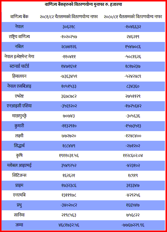 नेपालका २० वाणिज्य बैंकहरुले ९ महिनामा ४१ अर्ब ३५ करोड मुनाफा कमाए पनि १० वाणिज्य बैंकहरुको वितरण योग्य नाफा ऋणात्मक देखिन्छ । भन्दा फरक पर्दैन । ९ महिनामा ४१ अर्ब २५ करोड रुपैयाँ मुनाफा कमाए पनि वाणिज्य बैंकहरुको लाभांश वितरण क्षमता भने निक्कै कमजोर देखिएको छ । २० वटा वाणिज्य बैंकको वितरणयोग्य मुनाफा जम्मा ४ अर्ब ६८ करोड रुपैयाँ मात्र छ । आधा दर्जन वाणिज्य बैंक लाभांश वितरण गर्न नसक्ने अवस्थामा देखिएका छन् । चालु आर्थिक वर्ष २०८१÷८२ को तेस्रो त्रैमास (चैत मसान्त)सम्म आधा दर्जन वाणिज्य बैंकको वितरणयोग्य मुनाफा ऋणात्मक भेटिएको छ । भन्दा फरक पर्दैन ।