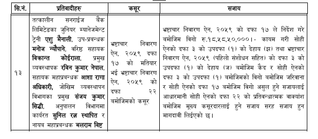 आयोगले प्रमुख आरोपितहरूमा तत्कालीन सनराइज बैंकका प्रमुख कार्यकारी अधिकृत (सीईओ) किशोरकुमार महर्जन, सहायक महाप्रबन्धक नीता प्रधान, जोखिम विभागका अधिकृत सुजित पोखरेल, शाखा प्रबन्धक राजीव सापकोटा र अधिकृत ममता पराजुली लगायतका बैंकका अधिकारीहरू छन् । यस्तै, सनराइजबैंकै अन्य कर्मचारीहरू जुनियर म्यानेजमेन्ट ट्रेनी एशु मैनाली, उपप्रबन्धक मनोज न्यौपाने, वरिष्ठ सहायक विक्रान्त कोइराला, प्रमुख व्यवस्थापक रविनकुमार नेपाल, सहायक महाप्रबन्धक आशा राणा अधिकारी, जोखिम व्यवस्थापन विभागका प्रमुख सञ्जयकुमार सिद्धी, अनुपालन विभागमा कार्यरत सुनिलरत्न स्थापित र नायब महाप्रबन्धक बलराम विष्ट पनि आरोपित छन् । अख्तियारका अनुसार तत्कालिन सनराइज बैंकका यी अधिकारीहरूले मिलेर पतञ्जलीको नाममा काभ्रेमा रहेको सरकारी जग्गाको धितो बन्धक पारित गरि ऋण प्रवाह गरेका थिए ।