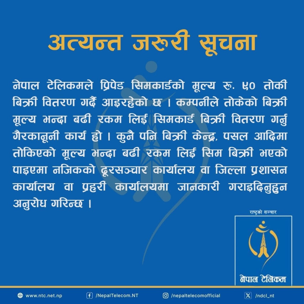 नेपाल टेलिकमले प्रिपेड सिमकार्डको मूल्य ९० तोकिएको स्पष्ट गर्दै तोकिएको मूल्यभन्दा बढी रकम लिई सिम बिक्री गर्नेलाई कारबाहीको चेतावनी दिएको छ।कम्पनीले उपभोक्तालाई सिमकार्ड खरिद गर्दा तोकिएको मूल्यभन्दा बढी तिर्न नपर्ने भन्दै सजग रहन अनुरोध गरेको छ। यदि कुनै पनि बिक्री केन्द्र, पसल वा अन्य माध्यमबाट निर्धारित मूल्यभन्दा बढी रकम लिई सिमकार्ड बिक्री गरिएको पाइएमा उपभोक्ताले तत्कालै नजिकको दूरसञ्चार कार्यालय, जिल्ला प्रशासन कार्यालय वा प्रहरी कार्यालयमा जानकारी गराउन सक्नेछन्।