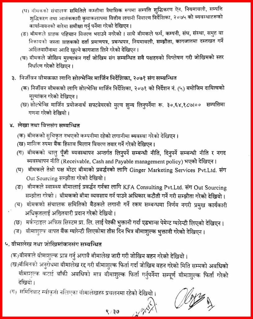 – बीमकको चालु पूँजी व्यवस्थापन अन्तर्गत लिनुपर्ने सम्बन्धी नीति, दिनुपर्ने सम्बन्धी नीति र नगद व्यवस्थापन नीति भएको देखिएन ।