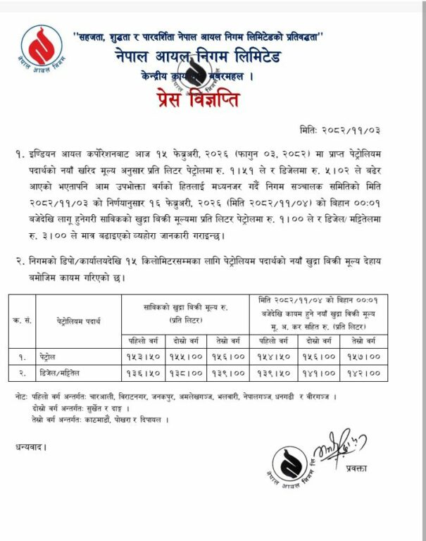 निगम सञ्चालक समितिको निर्णयअनुसार सोमबार (फागुन ०४ गते) बिहान ००:०१ बजेदेखि लागू हुने गरी पेट्रोलमा प्रतिलिटर १ रुपैयाँ तथा डिजेल र मट्टीतेलमा प्रतिलिटर ३ रुपैयाँ बढाइएको छ।