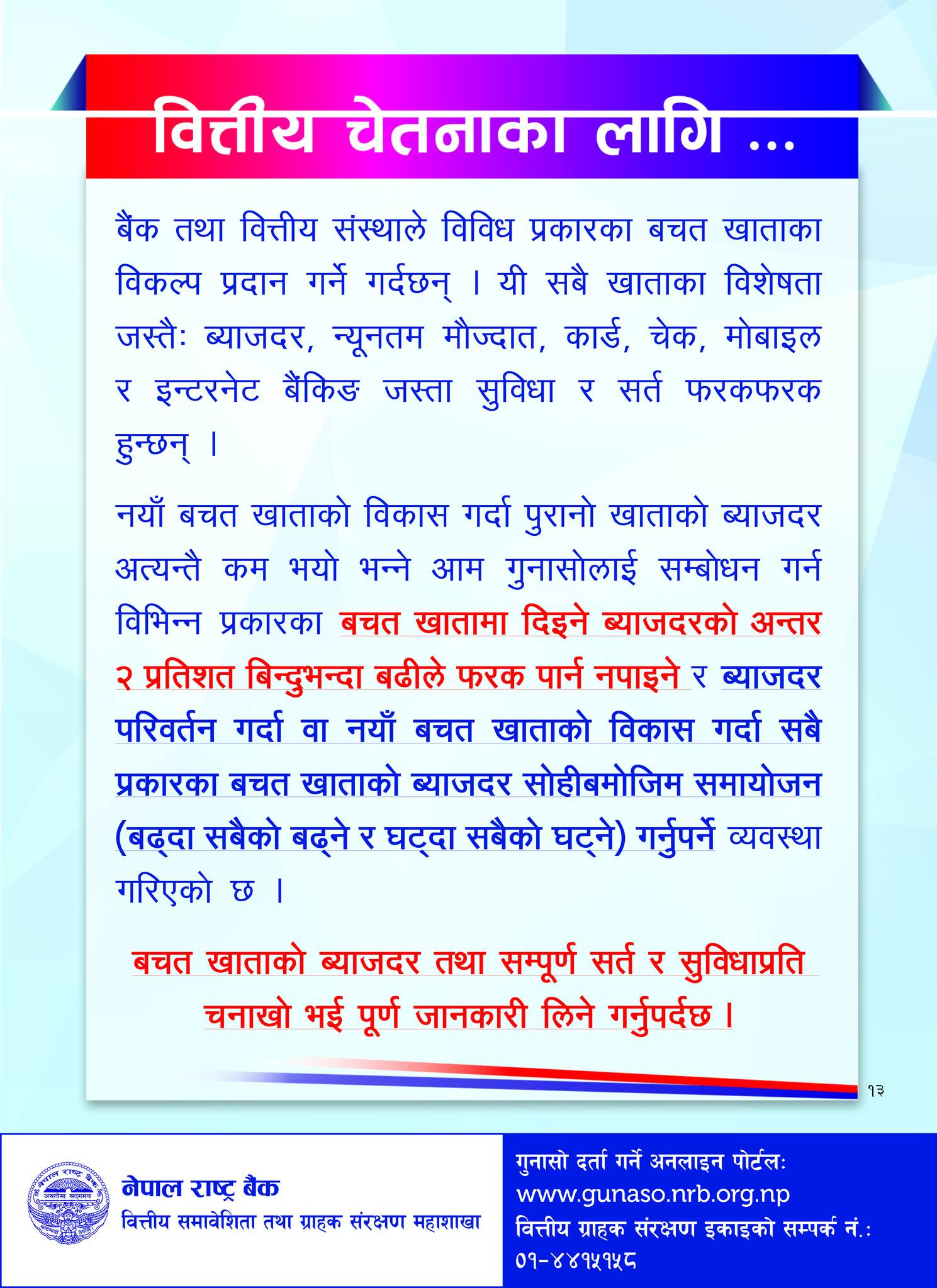 राष्ट्र बैंकले बचत खाताको ब्याजदर तथा सम्पूर्ण सर्त र सुविधाप्रति चनाखो भई पूर्ण जानकारी लिनपनि सुझाव दिएको छ ।