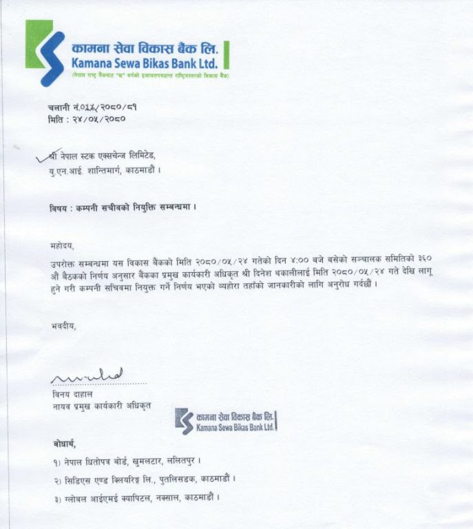 कामना सेवा विकास बैंकले प्रमुख कार्यकारी अधिकृत (सीइओ) दिनेश थकालीलाई नै कम्पनी सचिवको जिम्मेवारी दिएको छ । यही भदौ २४ गते बसेको सञ्चालक समितिको बैठकले थकालीलाई कम्पनी सचिवमा पनि नियुक्ति गरेको हो । थकाल २०८० बैशाख १४ गते बैंकको सीइओमा नियुक्ति भएका थिए ।
